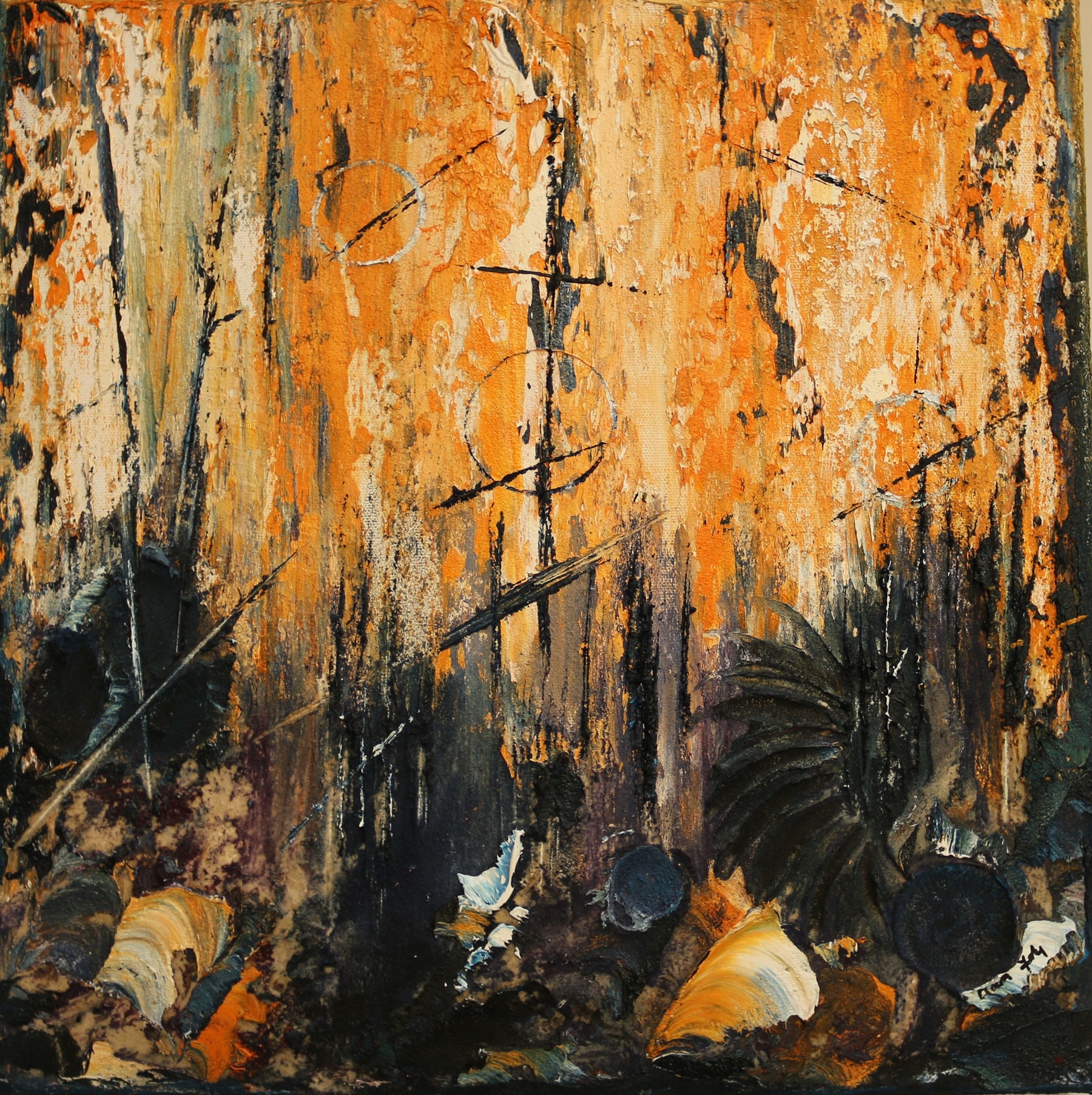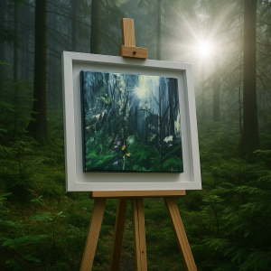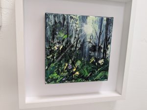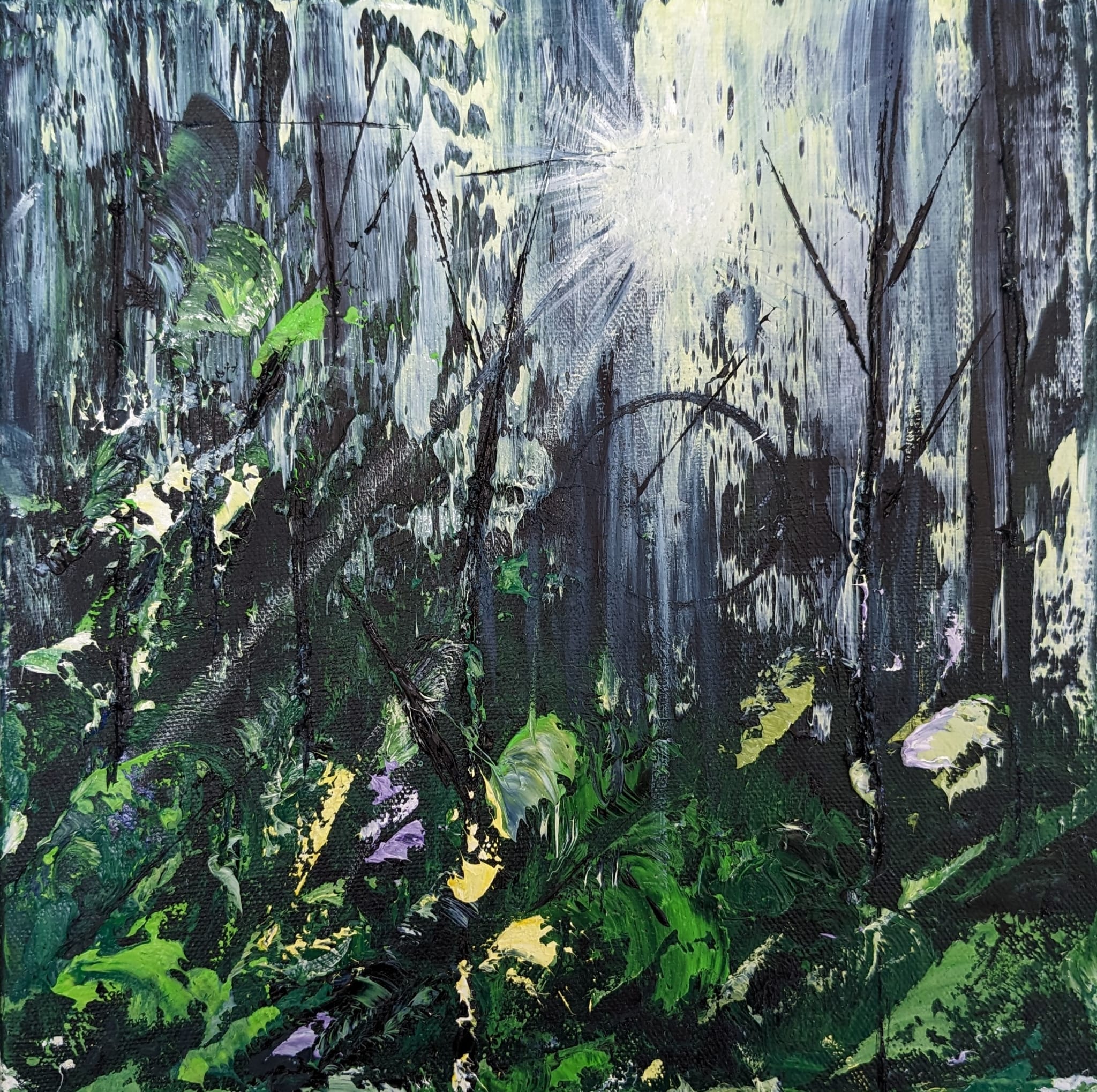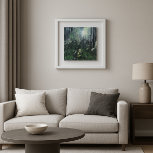 “Mystic Light” captures the moment when dawn breaks through a hushed forest, illuminating the darkened greens and deep shadows of nature’s secret places. Brushstrokes of emerald, violet, and pale yellow weave together to evoke moss, ferns, and dappled undergrowth – each glimmer touched by a burst of mystical white light that pierces through the trees. The painting embodies a quiet transcendence, where the spiritual and natural worlds briefly touch. Rich in texture and atmosphere, this piece draws the viewer into its mysterious woodland glow, offering a sense of peace, wonder, and renewal.