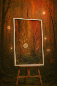 Textured Wood is a deeply atmospheric woodland painting created with rich layers of texture, earthy colour, and glowing accents that evoke the quiet magic of an autumn forest. Warm oranges, deep greens, and ethereal orbs blend together to form a vivid, dreamlike landscape that feels alive with hidden energy. This piece invites the viewer into a world where nature meets imagination- where shadows, branches, and light create a sense of mystery and depth.
